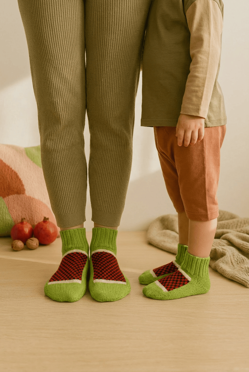 ترکیب رنگ سبز، قرمز و سفید بهصورت مشخص حالوهوای هندوانه شب یلدا را تداعی میکند و باعث میشود این مدل برای عکسهای خانوادگی، تمهای مناسبتی و هدیه دادن، انتخابی بسیار جذاب باشد. کشبافت دور مچ، انعطاف بالایی دارد و مدل را بهصورت فریسایز برای خانمها و کودکان مناسب میکند. بنابراین مادر و کودک میتوانند به راحتی یک ست یلدایی داشته باشند؛ ستهایی که هم در عکسها جذاب است و هم برای استفاده روزمره در روزهای سرد، کاملاً کاربردی.